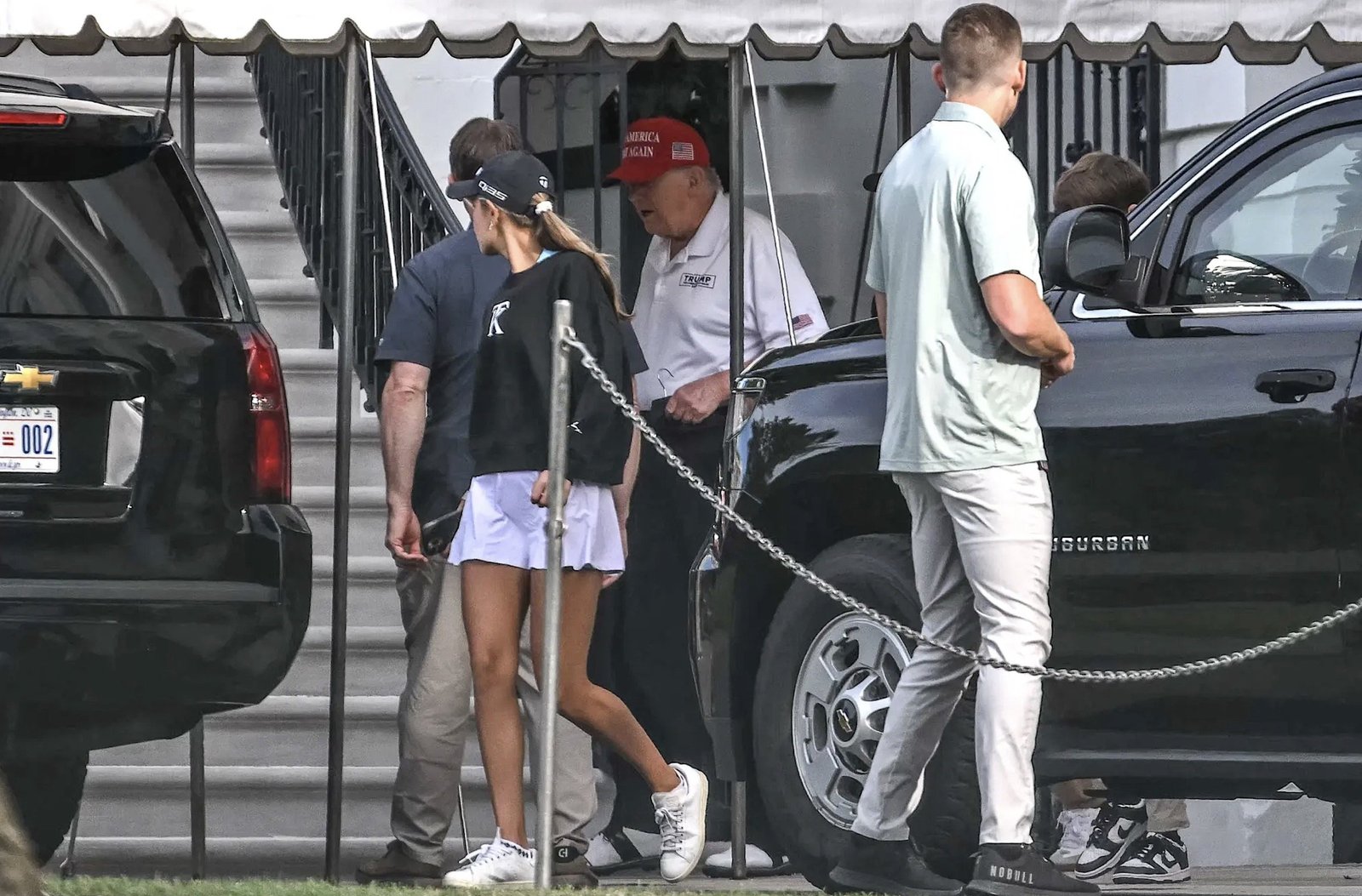 Round 8:45 a.m., President Trump was photographed in a crisp white polo, black pants, and his iconic crimson MAGA hat, accompanied by his granddaughter Kai Trump. The 2 have been seen exterior the White Home loading right into a car on their technique to his golf membership in Sterling, Virginia.